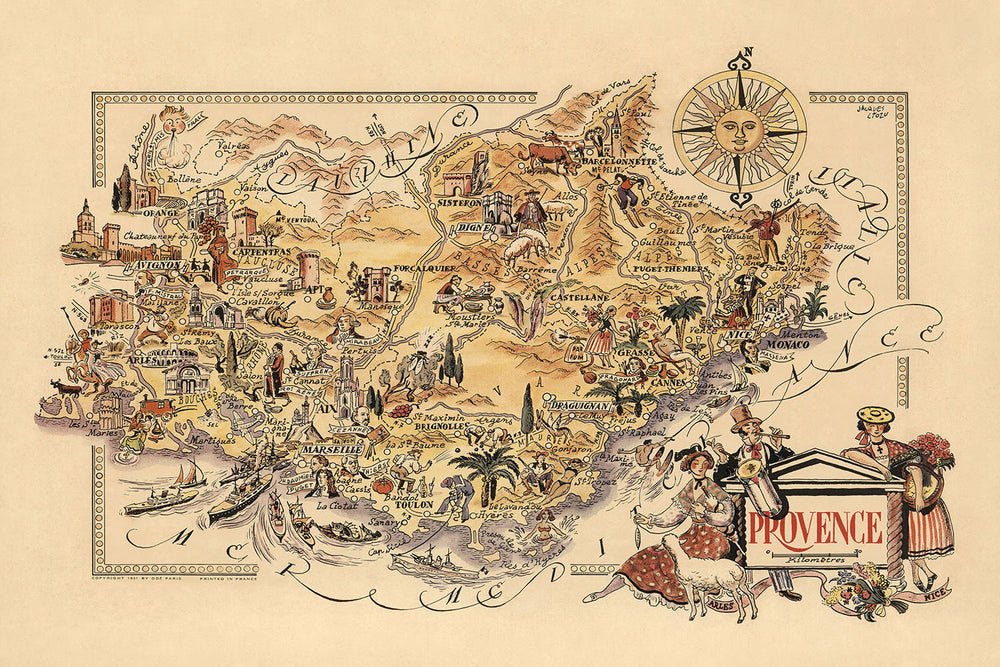 'Provence' est plus qu'une représentation géographique ; c'est une célébration d'une région imprégnée d'histoire, de culture et de beauté naturelle. Elle capture l'essence de la Provence, des plages ensoleillées de la Côte d'Azur à la beauté sauvage des montagnes des Alpilles. Que vous soyez un passionné d'histoire, un amoureux de la culture française ou simplement un connaisseur d'art raffiné, cette carte offre un voyage captivant à travers l'une des régions les plus enchanteresses de France.