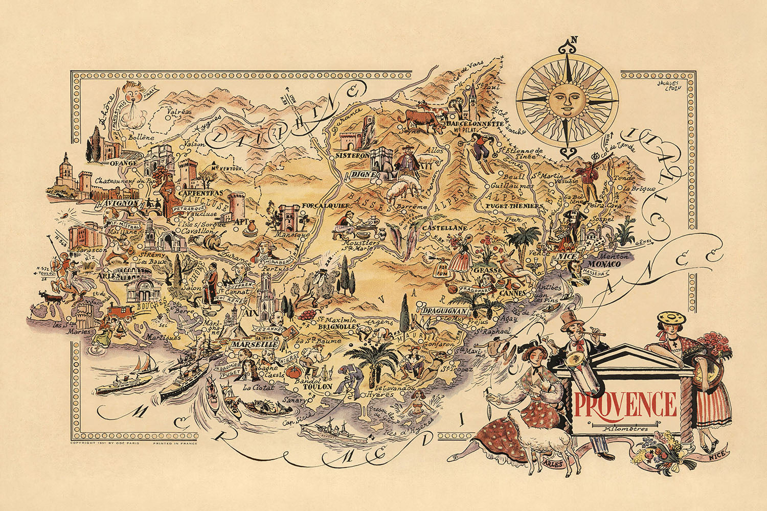 Ancienne carte de Provence, France par Liozu, 1951: Marseille, Avignon, Cannes, Nice, Monaco