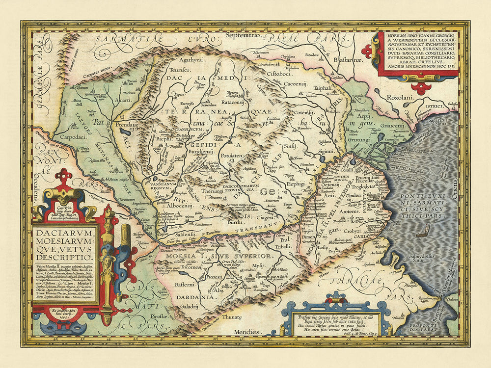 Ancienne carte de la Roumanie et de la Bulgarie par Ortelius, 1603: fleuve Danube, montagnes des Carpates, mer Noire, Dacie, Mésie