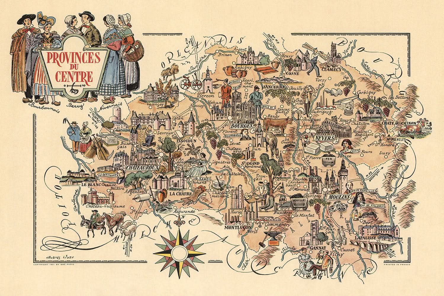 Anciennes Provinces du Centre Carte Picturale par Liozu, 1951: Orléans, Bourges, Vignobles