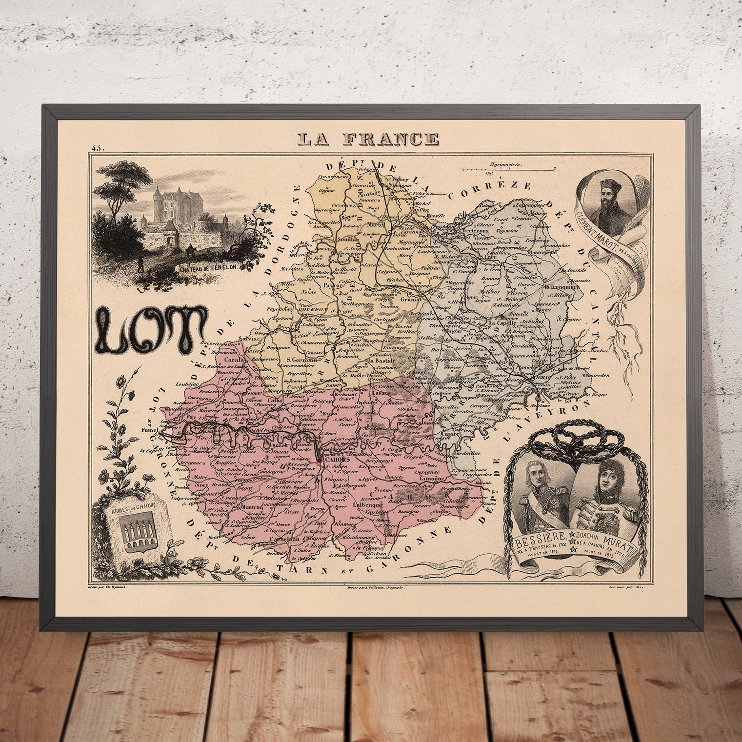 Created when France’s departmental framework had matured into a language of governance and education, Vuillemin’s Lot captures a nation thinking in regions. It is part gazetteer, part stage-set: the ornate cartouche hints at allegories of agriculture and industry, while the peripheral texts translate scenery into knowledge. In these plates, Vuillemin advanced a distinctly French cartographic ideal—where aesthetics dignify data, and local pride is taught alongside coordinates. The map’s disciplined depiction of political boundaries, entwined with heraldry, portraits, and scenes of labor and leisure, preserves the 19th-century conviction that geography forms citizens. For the connoisseur, it offers not only a lucid plan of Lot, but an enduring meditation on how a landscape becomes a culture.