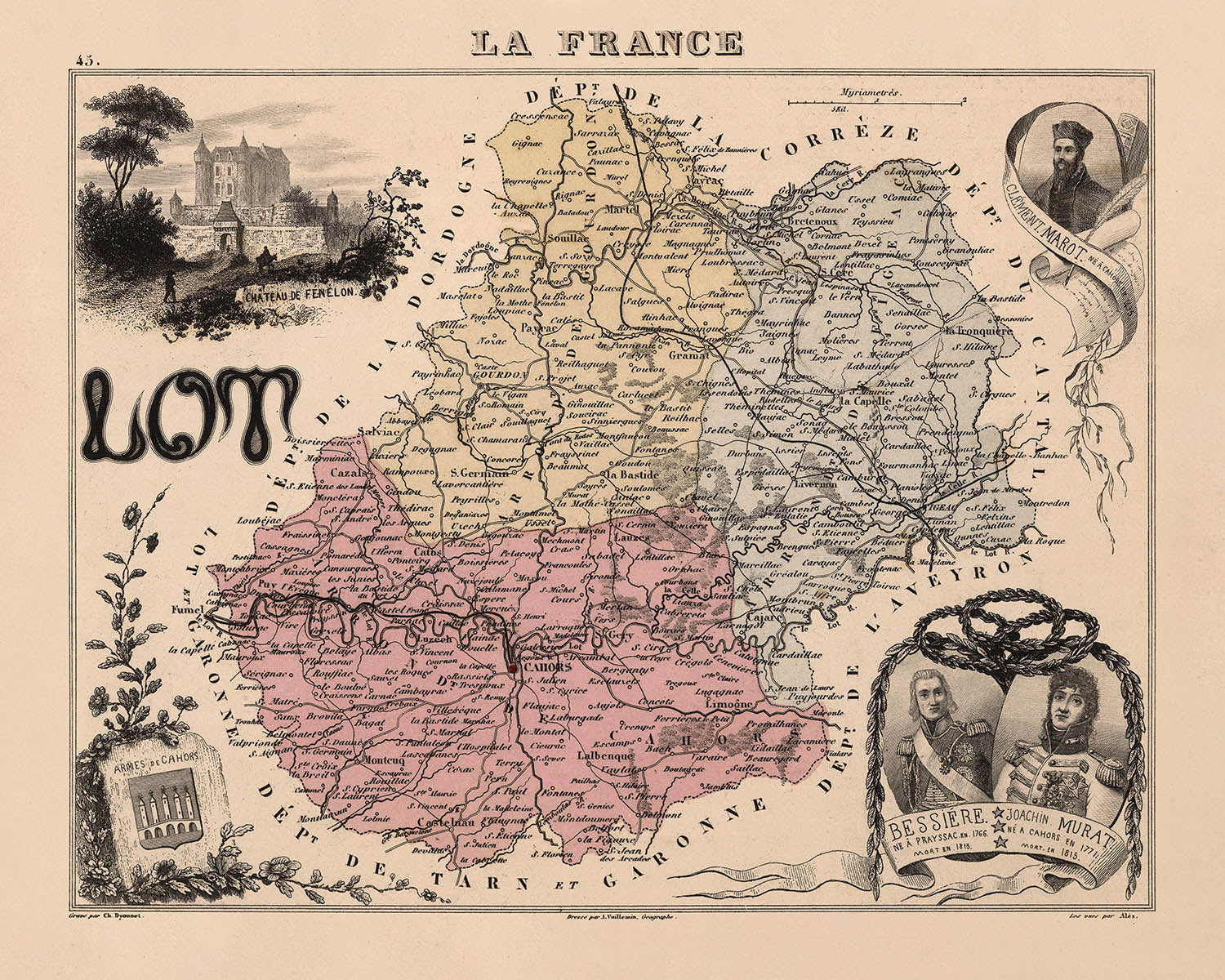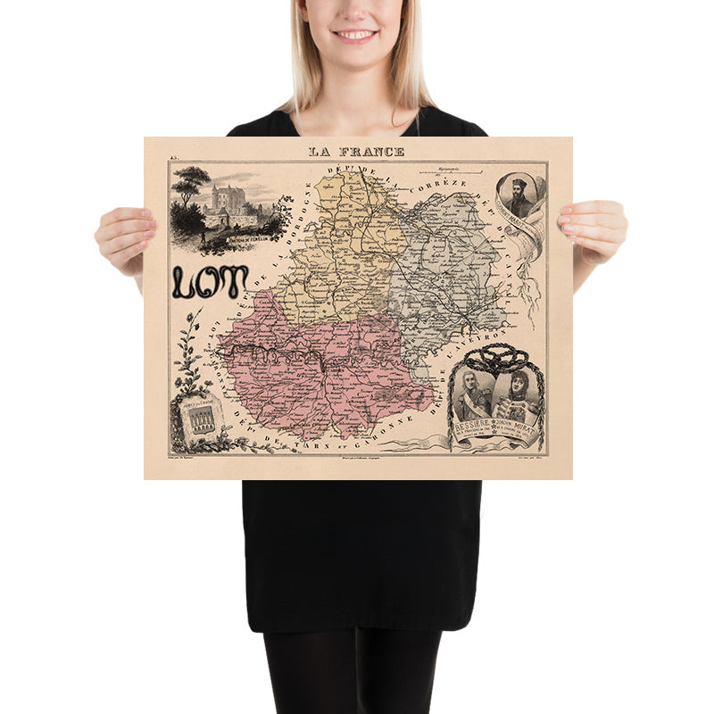 Old Pictorial Map of Lot, France by Vuillemin, 1869: Cahors, Figeac, Gourdon, Lot River, Rocamadour