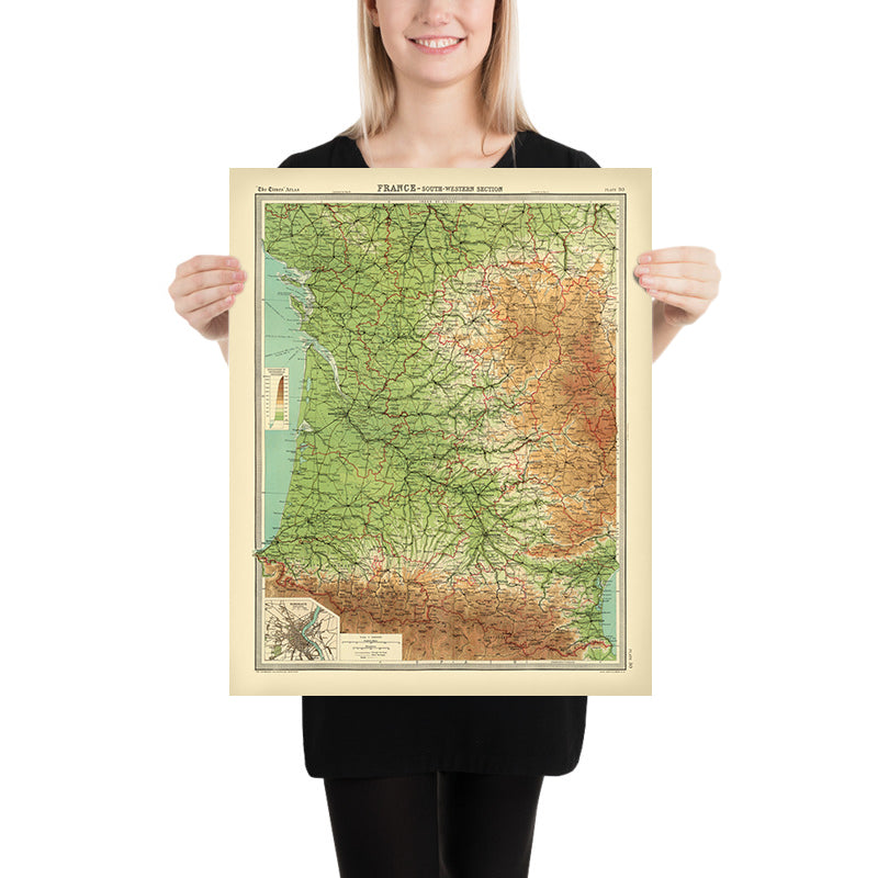 Old Topographic Map of South West France by Bartholomew, 1922: Bordeaux, Toulouse, Pyrenees, Bay of Biscay, Gironde Estuary