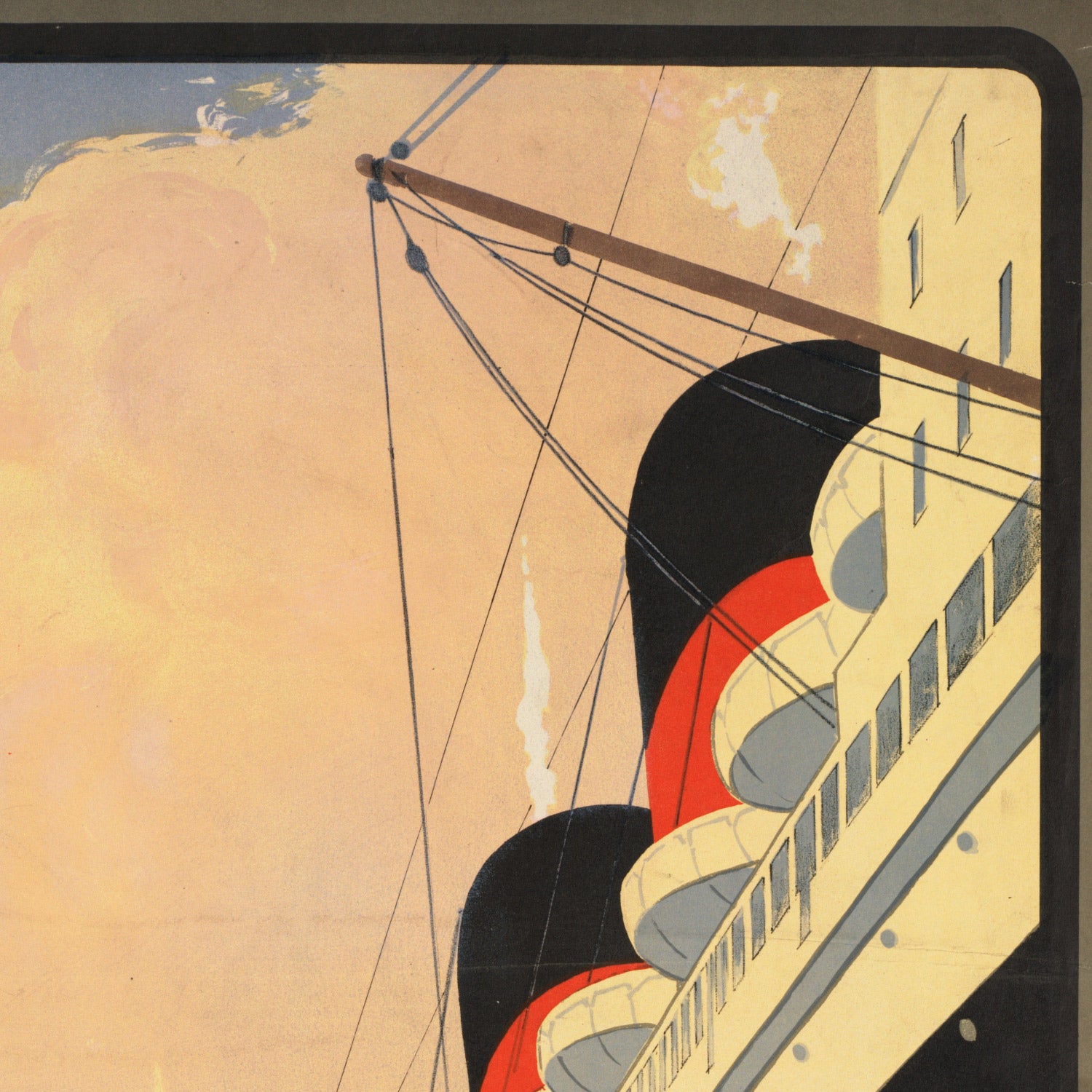 This poster’s subject is historically significant: it advertises a coordinated rail-and-sea itinerary that linked the cultural heart of Paris with the deep-water port of Le Havre and the skyscraper silhouette of New York. At a time when steam power shrank oceans and timetables promised certainty, such routes symbolized international exchange, new opportunities, and the magnetic pull of two world capitals. Displaying this print brings that spirit of global connection—France to America, continent to continent—into the home.