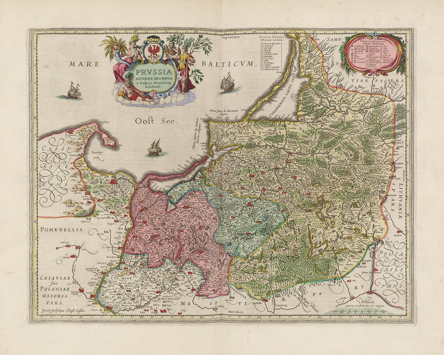 Ancienne carte de la Voïvodie de Varmie-Mazurie (Prusse) par Joan Blaeu, 1665: Olsztyn, Elbląg, Ełk, Ostroda et Giżycko, avec les lacs mazuriens, Biskupiec et Łyna
