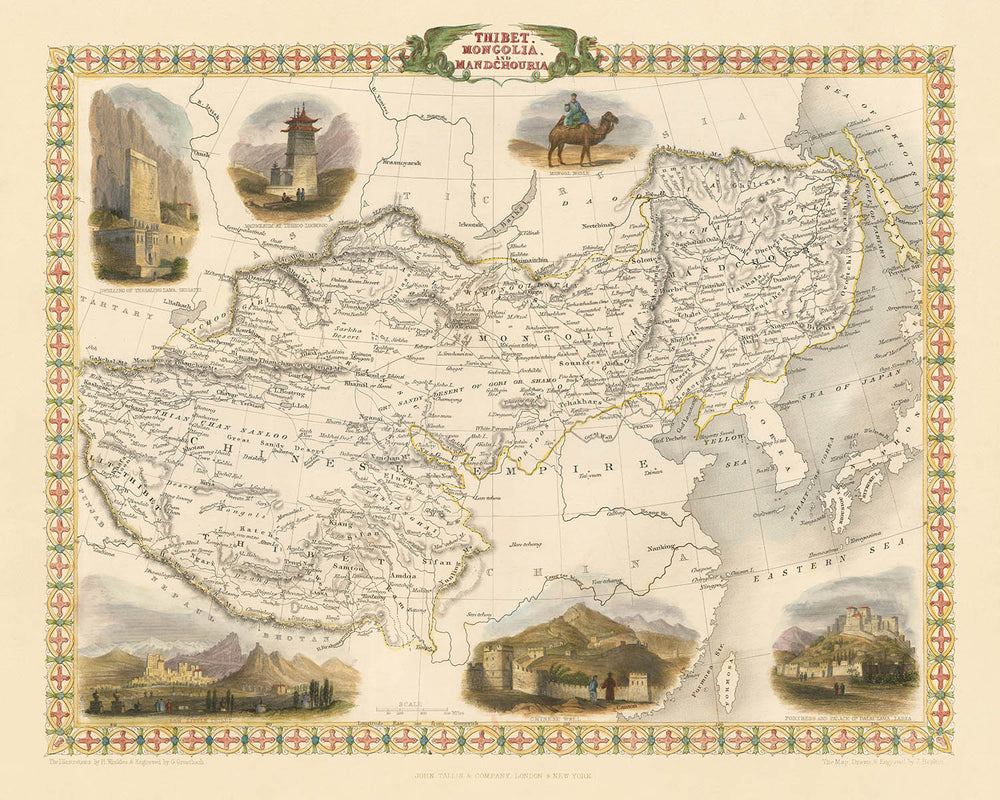 John Tallis, renommé comme l'un des derniers grands cartographes décoratifs, a imprégné ses œuvres d'un sentiment d'émerveillement et de découverte. Ses cartes se distinguent non seulement par leur précision géographique mais aussi par leurs ornements raffinés—ici, une série de vignettes exquises entourent la carte, chacune capturant l'esprit et la grandeur des terres représentées. De la majestueuse Demeure du Lama Tessaling à l'imposante Forteresse et Palais du Dalai Lama, ces illustrations évoquent le mystère et l'attrait qui ont tant fasciné le public victorien.
