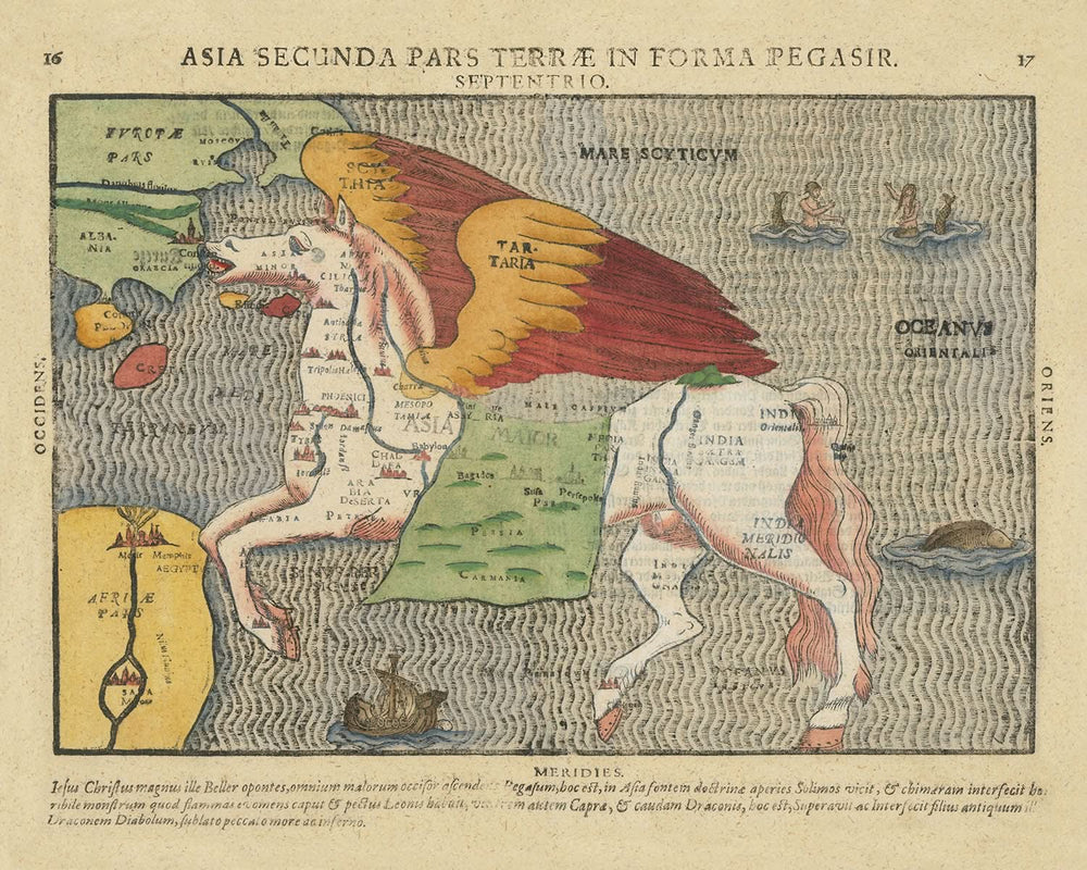 La conception de la carte est aussi imaginative que détaillée. Bunting a habilement dessiné les contours des territoires d'Asie pour former la silhouette de Pégase, le corps du cheval s'étendant du Moyen-Orient à l'Asie de l'Est et ses ailes s'étendant jusqu'aux territoires de la Russie. La péninsule arabique est astucieusement positionnée comme la tête du cheval, pointant vers l'ouest. Malgré sa forme fantaisiste, la carte conserve une précision géographique, avec des villes et des régions clés comme Jérusalem, la Perse et l'Inde méticuleusement indiquées.