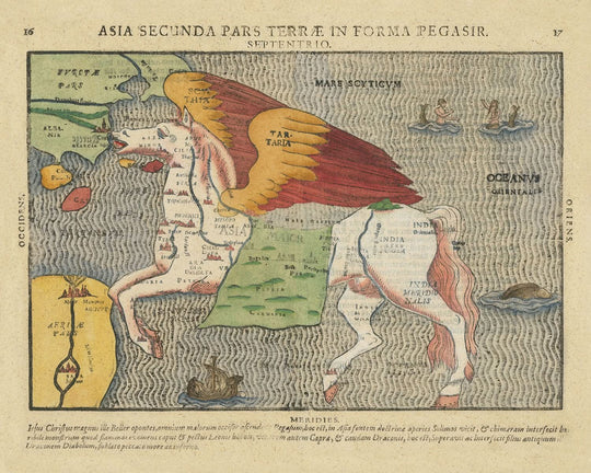 L'ouvrage Asia Secunda Pars Terrae in Forma Pegasi de Heinrich Bunting est plus qu'une carte : c'est un artefact historique qui comble le fossé entre le monde connu et l'imagination. Son mélange de précision cartographique et de symbolisme mythique offre un aperçu unique du passé, où les cartes n'étaient pas seulement des outils de navigation, mais aussi des supports de narration et d'exploration de l'esprit humain.
