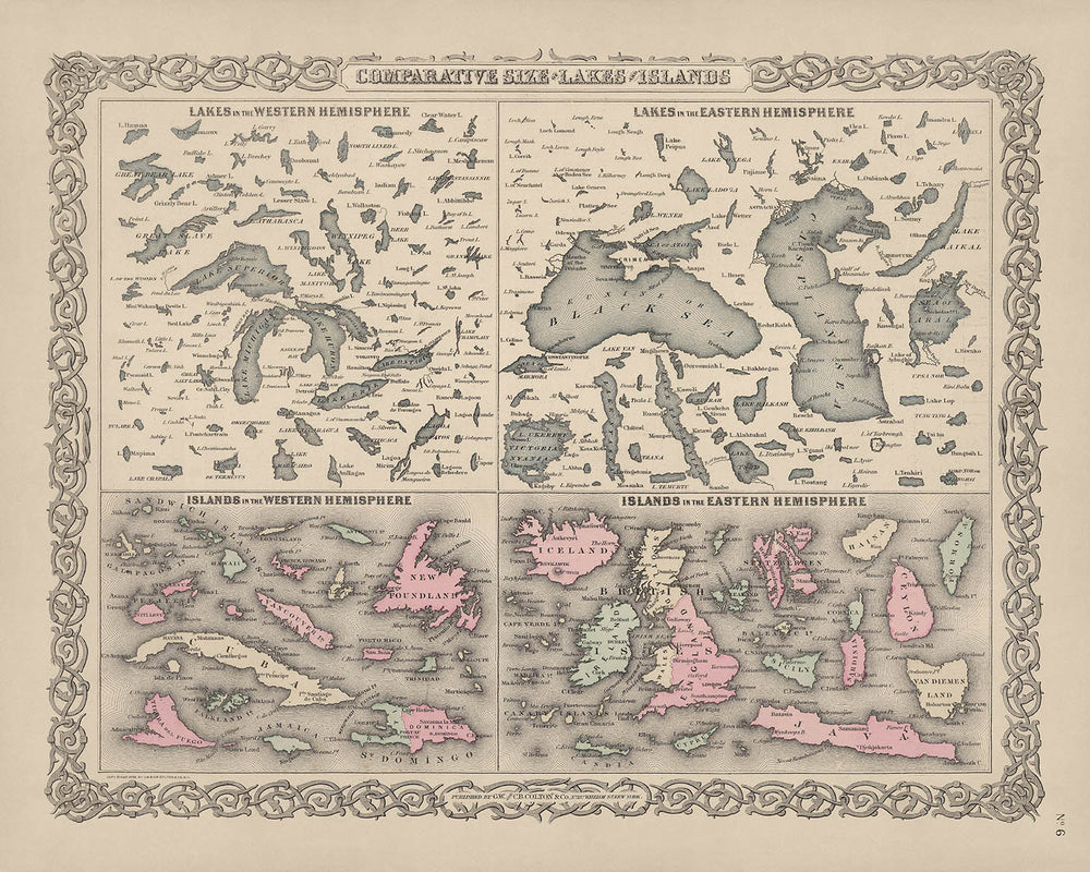 La taille comparative des lacs et des îles du monde, 1886: hémisphères nord et sud, Grands Lacs, mer Noire, etc.