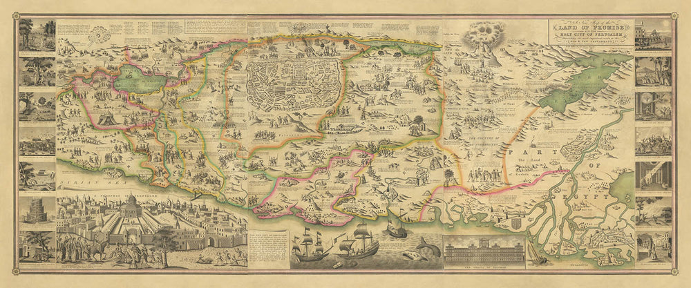 Ce qui distingue cette carte, c'est son récit richement illustré, donnant vie aux événements les plus cruciaux des Ancien et Nouveau Testaments. Des centaines de petites vignettes, chacune soigneusement gravée, représentent des moments tels que l'Exode, le passage de la mer Rouge, et Moïse recevant les Dix Commandements au sommet du Mont Sinaï. Ces scènes ne sont pas de simples décorations ; ce sont des points de repère historiques, invitant le spectateur à retracer les voyages, luttes et triomphes des figures bibliques à travers le terrain. L'approche picturale de la carte la transforme en un artefact unique—à la fois une œuvre d'art et un outil didactique pour comprendre le monde ancien.