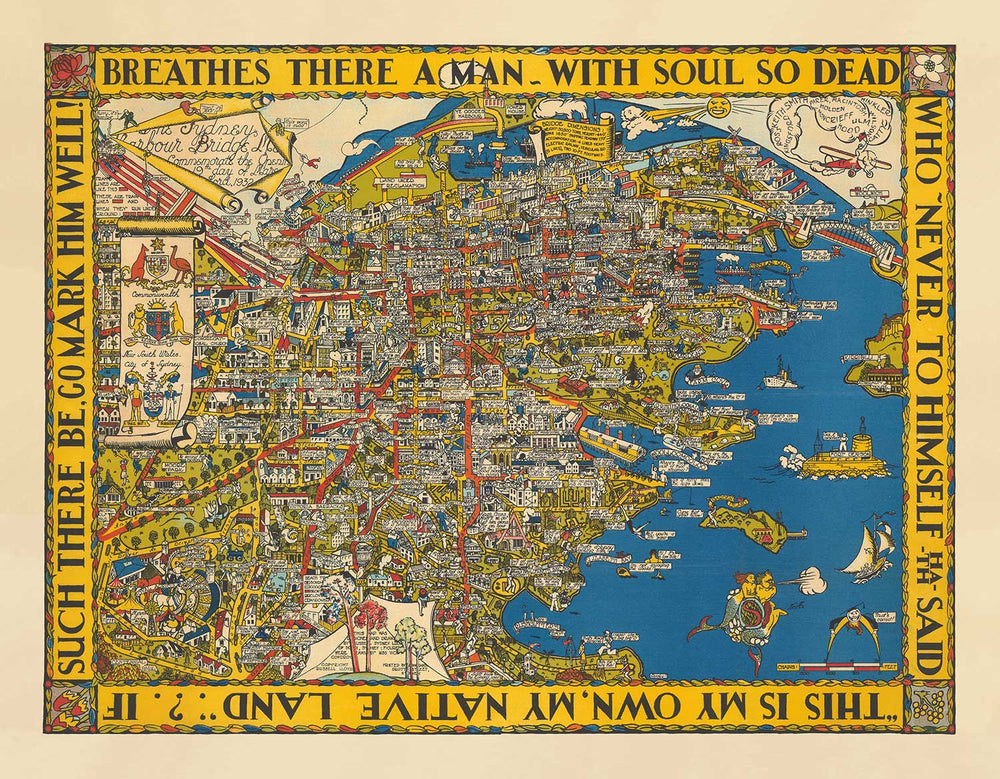 Cette carte a été publiée pour commémorer l'ouverture du pont de Sydney Harbour, et assurez-vous que le pont domine le coin supérieur droit de la carte.