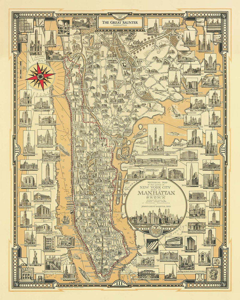 Cette carte est une lettre d'amour aux quartiers de Manhattan, chacun rendu avec soin et clarté. De l'étendue feuillue d'Inwood à l'extrémité nord de l'île aux rues animées du Financial District à son extrémité sud, la carte invite à explorer des enclaves historiques comme Harlem, Washington Heights, Greenwich Village, SoHo et Tribeca. La délimitation soignée de ces quartiers, entrelacée avec le parcours du Great Saunter, offre une perspective rare et panoramique des communautés diverses de Manhattan et de leur relation avec le littoral, une relation façonnée par des siècles de commerce, de culture et de renouvellement urbain.