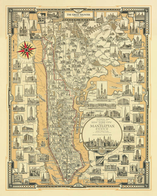 « Manhattan : The Great Saunter » est une carte de ville frappante qui capture avec élégance le littoral de 32 miles de Manhattan, invitant les spectateurs à suivre le légendaire parcours du Great Saunter dans les moindres détails. Le titre original de la carte, un clin d'œil à la fois à l'île emblématique et à la célèbre randonnée urbaine, signale immédiatement sa double nature en tant qu'artefact historique et hommage vivant à la rive toujours évolutive de New York. L'art de la carte est ancré dans la base magistrale de 1939 par Ernest Dudley Chase, dont le flair pictural et l'attention méticuleuse aux détails sont indéniables, tandis que les superpositions contemporaines de The Unique Maps Co. (2025) lui insufflent une nouvelle vie, chroniquant la transformation continue de la ville.