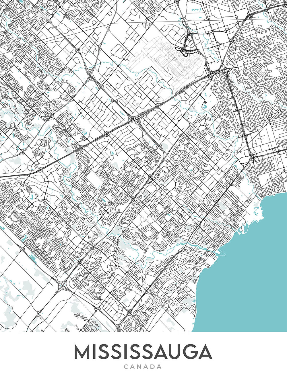 Cette carte de Mississauga est une œuvre d'art cartographique moderne et détaillée qui se concentre sur le tracé des rues de la ville sans la distraction des étiquettes. La carte couvre une vaste zone, comprenant le centre-ville, les rives du lac et les banlieues environnantes. C'est un excellent sujet de conversation et un complément parfait à n'importe quelle maison ou bureau.