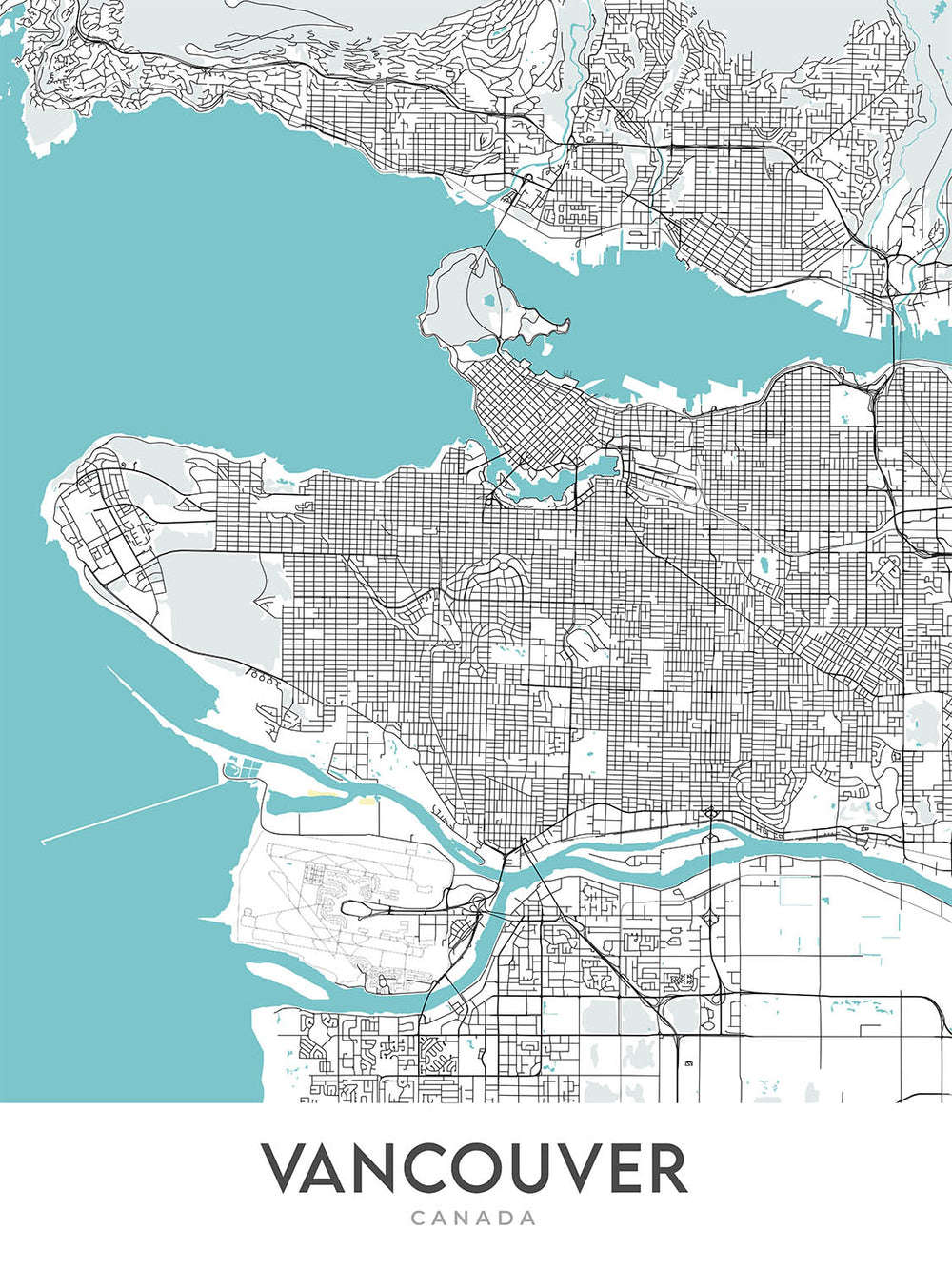 En plus de son attrait esthétique, cette carte est également un outil précieux pour quiconque souhaite en savoir plus sur Vancouver. La carte comprend des noms de rues et des points de repère détaillés, ce qui facilite la navigation dans la ville. Il montre également l'emplacement des parcs, des écoles, des hôpitaux et d'autres équipements importants.