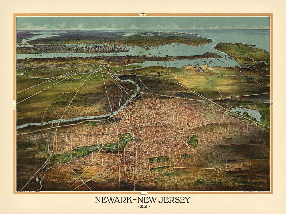 Ancienne carte Birdseye de Newark par Landis, 1916: Manhattan, port de Newark, chemins de fer, baie de New York