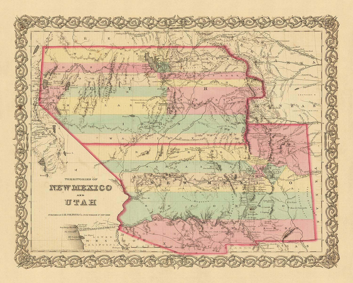 Voyagez dans le temps avec cette superbe carte ancienne du Nouveau-Mexique et de l'Utah, méticuleusement réalisée par JH Colton en 1856. Colton, largement considéré comme le premier cartographe américain de son époque, donne vie à la riche histoire de ces régions avec des détails époustouflants. Cette carte constitue un instantané d'un moment charnière des débuts de l'histoire des États-Unis, une époque où de nombreuses colonies que nous connaissons aujourd'hui n'avaient pas encore été fondées et où les noms et les frontières des territoires étaient en pleine évolution.