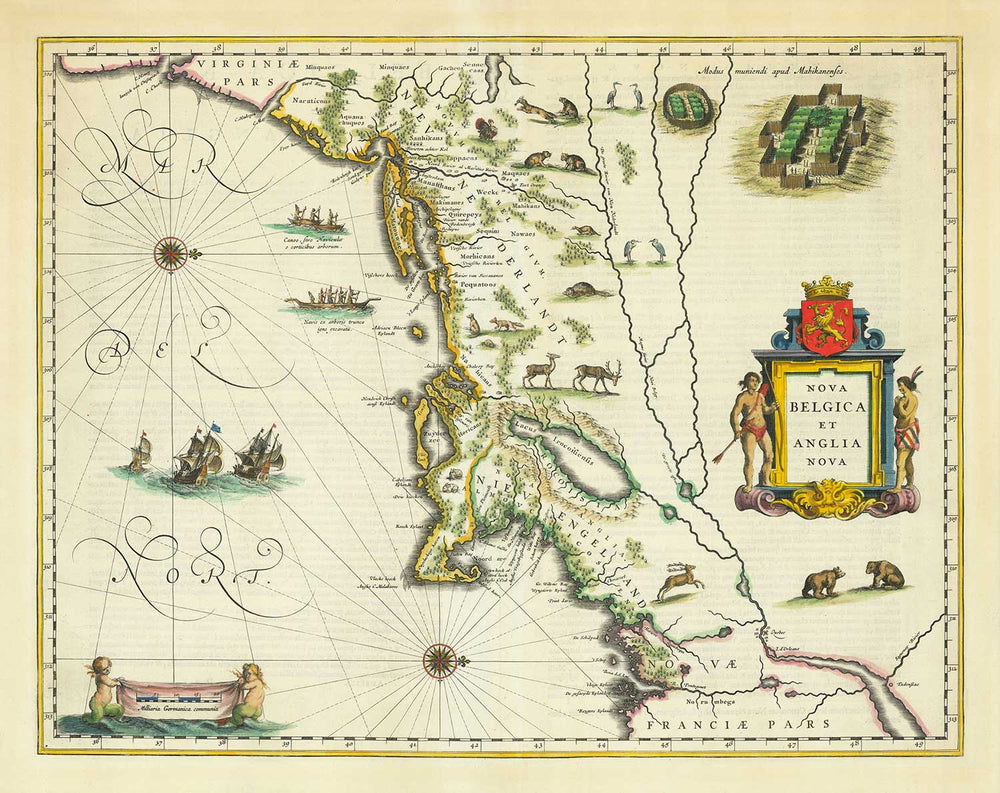 Ancienne carte des Nouveaux Pays-Bas et de la Nouvelle Angleterre en 1640 par Willem Blaeu: Manhattan, Providence, New York, Boston, New Jersey