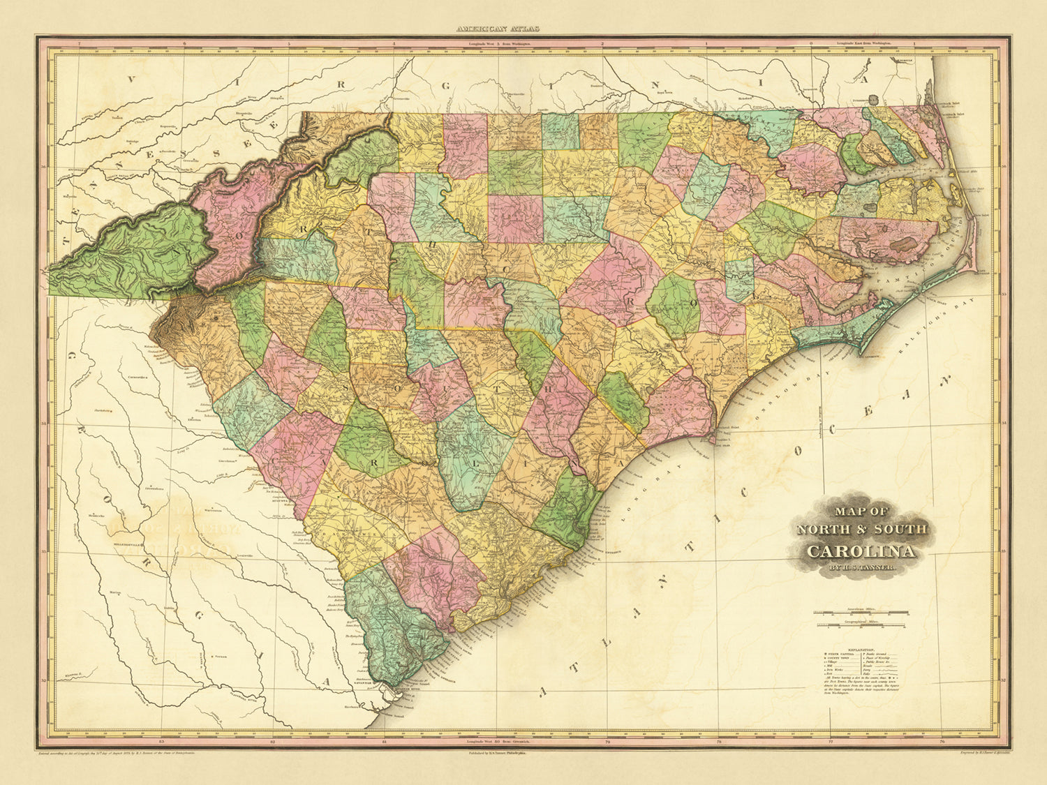 Cette carte magnifiquement détaillée de la Caroline du Nord et du Sud a été créée à l'origine par Henry Schenck Tanner en 1823. Cette carte offre un regard fascinant sur les Carolines au début du 19e siècle.