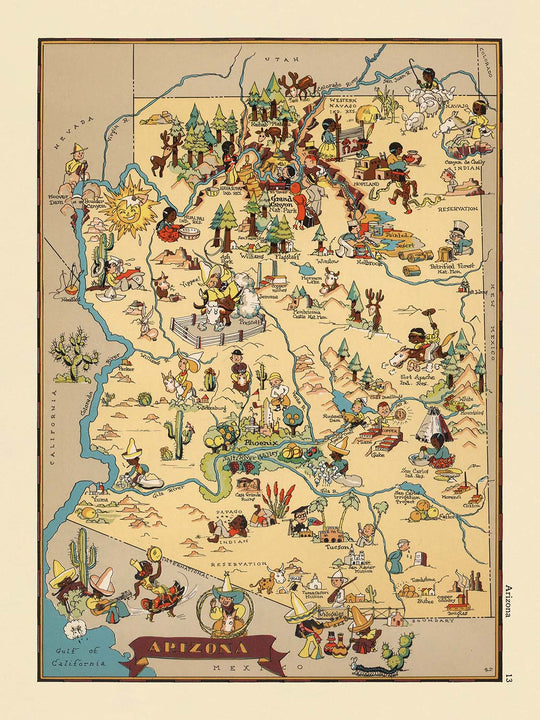 - La carte est richement ornée d'illustrations colorées et de style cartoon, offrant une représentation visuelle fantaisiste et engageante de l'Arizona.