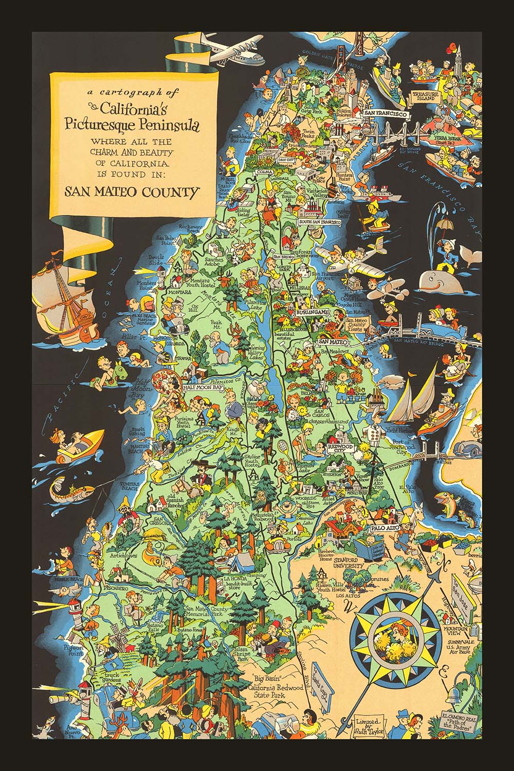 Carte picturale du comté de San Mateo, Californie par Ruth Taylor White, 1930: Chemin de fer Southern Pacific, Réservoir de Crystal Springs, Pont de Dumbarton, Redwood City, Half Moon Bay