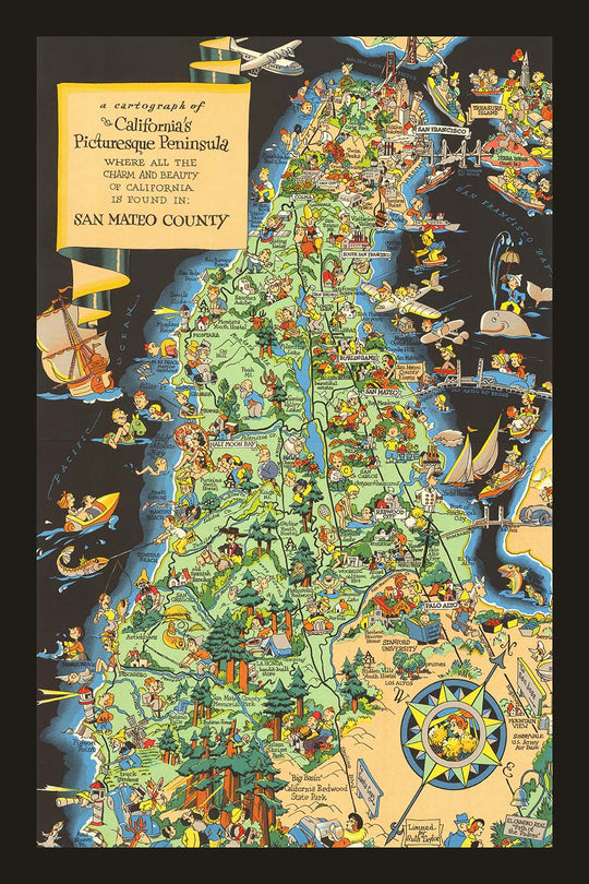 Ce qui distingue vraiment cette carte, c'est sa capacité à tisser ensemble le passé et le présent du comté, mettant en valeur à la fois son histoire riche et sa vie contemporaine vibrante. Les scènes ludiques de golf, d'équitation et de baignade reflètent les loisirs qui ont défini l'époque, tandis que l'inclusion des industries locales—comme la culture de fleurs et d'artichauts—témoigne de l'héritage agricole du comté. Les caricatures de résidents et de visiteurs engagés dans des activités quotidiennes offrent un sens de la personnalité et du lieu, faisant de la carte un témoignage vivant de l'esprit communautaire de San Mateo dans les années 1930.