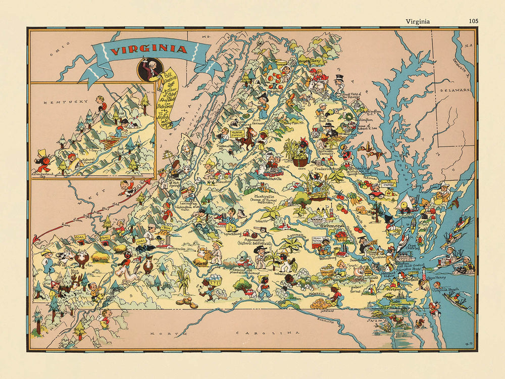 Le design de cette carte est un témoignage de la fascination de l'époque pour l'identité régionale et la couleur locale. Les champs de tabac, les figures coloniales et les scènes de plantation évoquent l'héritage agricole et colonial de la Virginie, tandis que les représentations de chevaux et d'activités maritimes mettent en lumière les traditions équestres et côtières de l'état. Les montagnes Blue Ridge se dressent dans des teintes douces, et la baie de Chesapeake est rendue avec un éclat, ancrant la carte dans sa géographie distinctive. Chaque élément visuel est choisi avec soin pour représenter les industries, les paysages et les histoires qui ont défini la Virginie au début du XXe siècle.