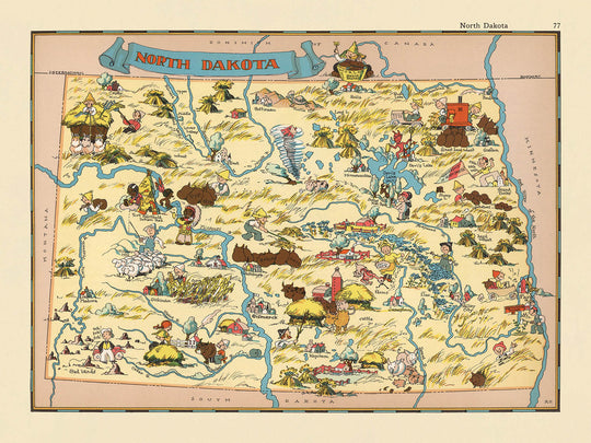 Carte picturale du Dakota du Nord par Ruth Taylor White, 1935: Fargo, Bismarck, rivière Missouri, champs de blé, bisons