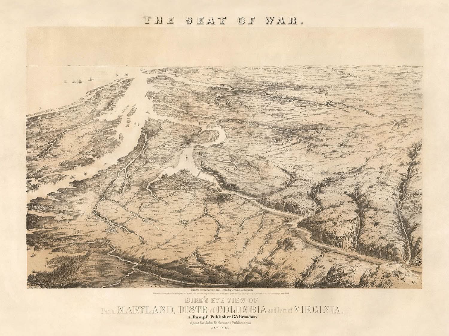La lithographie en couleur antique extraordinaire de John Bachmann intitulée "The Seat of War. Bird's Eye View of Part of Maryland, Distr of Columbia and Part of Virginia," date de 1861. Cette pièce emblématique offre une vue panoramique du théâtre de Virginie-Maryland pendant la guerre civile américaine, capturant le paysage à l'aube du conflit. L'œuvre de Bachmann reflète le génie technique et l'imagination qui définissent ses vues aériennes.