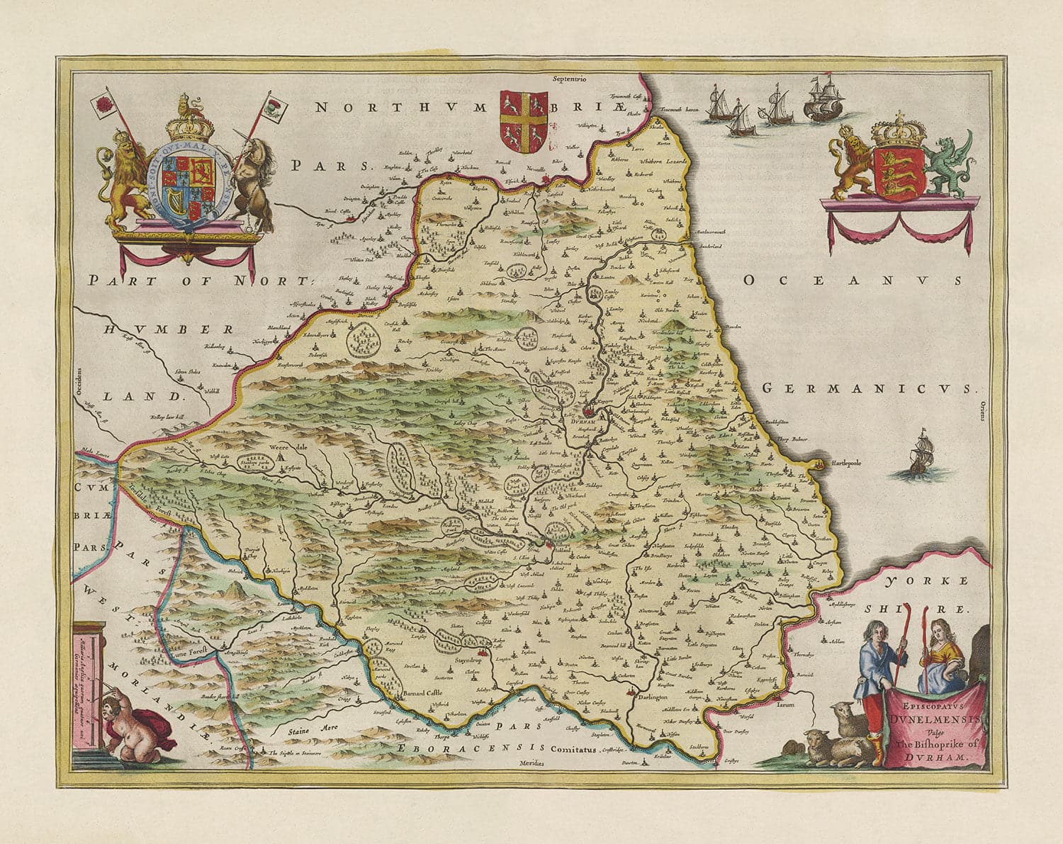 Ancienne Carte de County Durham, 1665 par Joan Blaaueu: Darlington, Stockton-On-Tees, Sunderland, Hartlepool, Newcastle, Gatlehead
