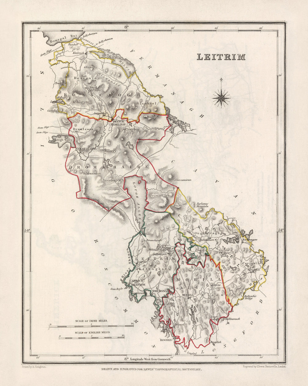 Ancienne carte du comté de Leitrim par Samuel Lewis, 1844 : Carrick-on-Shannon, Manorhamilton, Drumshanbo, Dromahair, Lough Allen
