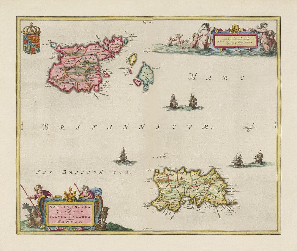 Ceci est une carte en couleur pleine, extrêmement rare et ancienne des bailliages de Jersey et de Guernesey dans la Manche, réalisée par le maître cartographe Joan Blaeu depuis son atelier à Amsterdam et publiée à l'origine dans ce Theatrum Orbis Terrarum Sive Atlas Novus en 1665.