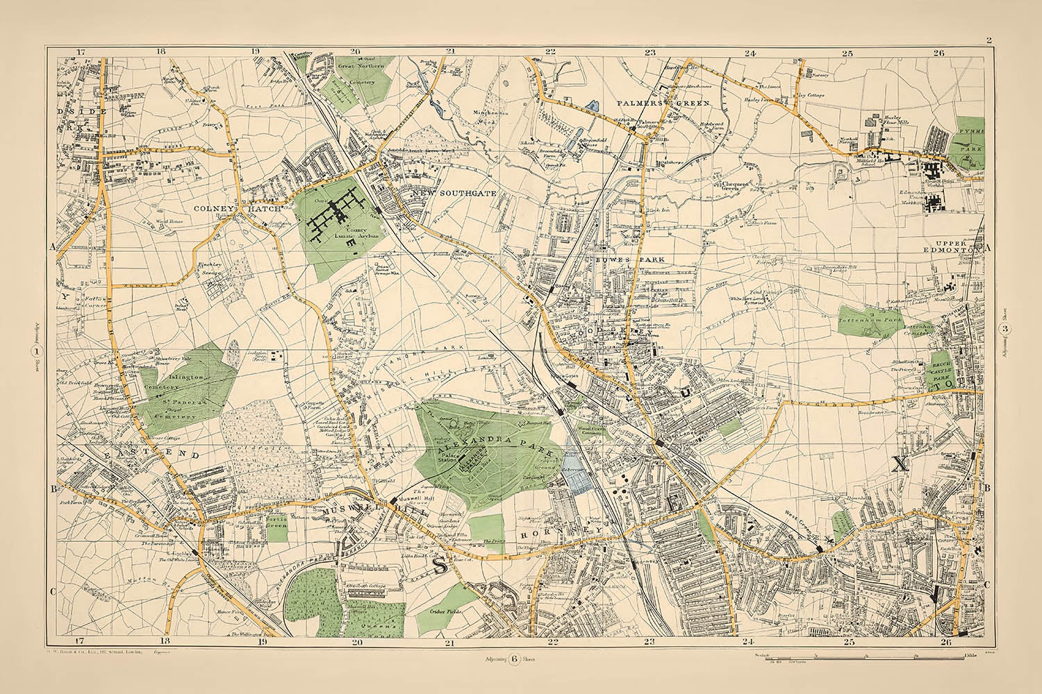 La carte détaille magnifiquement des quartiers significatifs tels que Colney Hatch, Upper Edmonton et Muswell Hill, chacun ayant sa propre histoire à raconter. Colney Hatch, connu pour son asile, fournit un rappel poignant de l'histoire sociale de l'époque. Pendant ce temps, Muswell Hill, avec sa communauté en plein essor, reflète la croissance et le changement qui ont caractérisé Londres à la fin du siècle. Ces zones, représentées avec précision et soin, vous invitent à explorer la riche tapisserie du passé du nord de Londres.