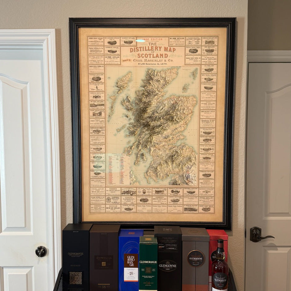 Avec 41 bouteilles de whisky expédiées d'Écosse chaque seconde, c'est l'une des plus grandes exportations du pays. Cette carte, qui date de plus de 100 ans, montre cent vingt-sept distilleries qui entouraient le pays à l'époque.