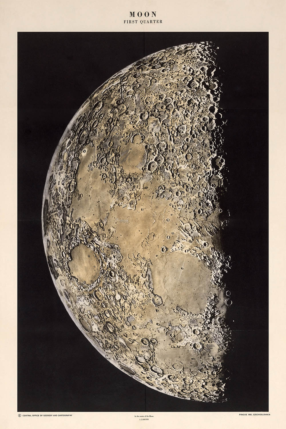 Le "Premier Quartier de la Lune," initialement intitulé "Lune : Premier quartier," est une remarquable lithographie couleur antique créée par Josef Klepešta en 1961. Cette œuvre d'art capture une carte détaillée de la lune pendant son premier quartier, mettant en avant ses cratères et montagnes lunaires proéminents, basée sur des photographies prises à l'Observatoire Lick en Californie et d'autres observatoires internationaux.