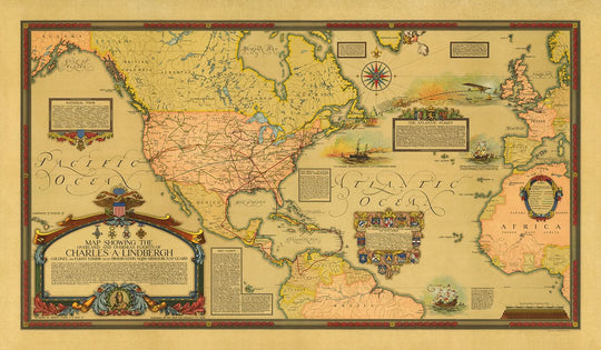 Géographiquement, la carte couvre les continents, mettant en valeur l'Amérique du Nord, l'Europe et l'Afrique, ainsi que des pays clés comme les États-Unis, la France et le Maroc. Les étendues d'eau, notamment les vastes océans Pacifique et Atlantique, sont élégamment étiquetées, offrant un contexte aux voyages audacieux de Lindbergh. Des annotations et des notes historiques disséminées sur la carte offrent un aperçu des lieux et des événements importants, ce qui en fait une mine d'informations pour les passionnés d'histoire.