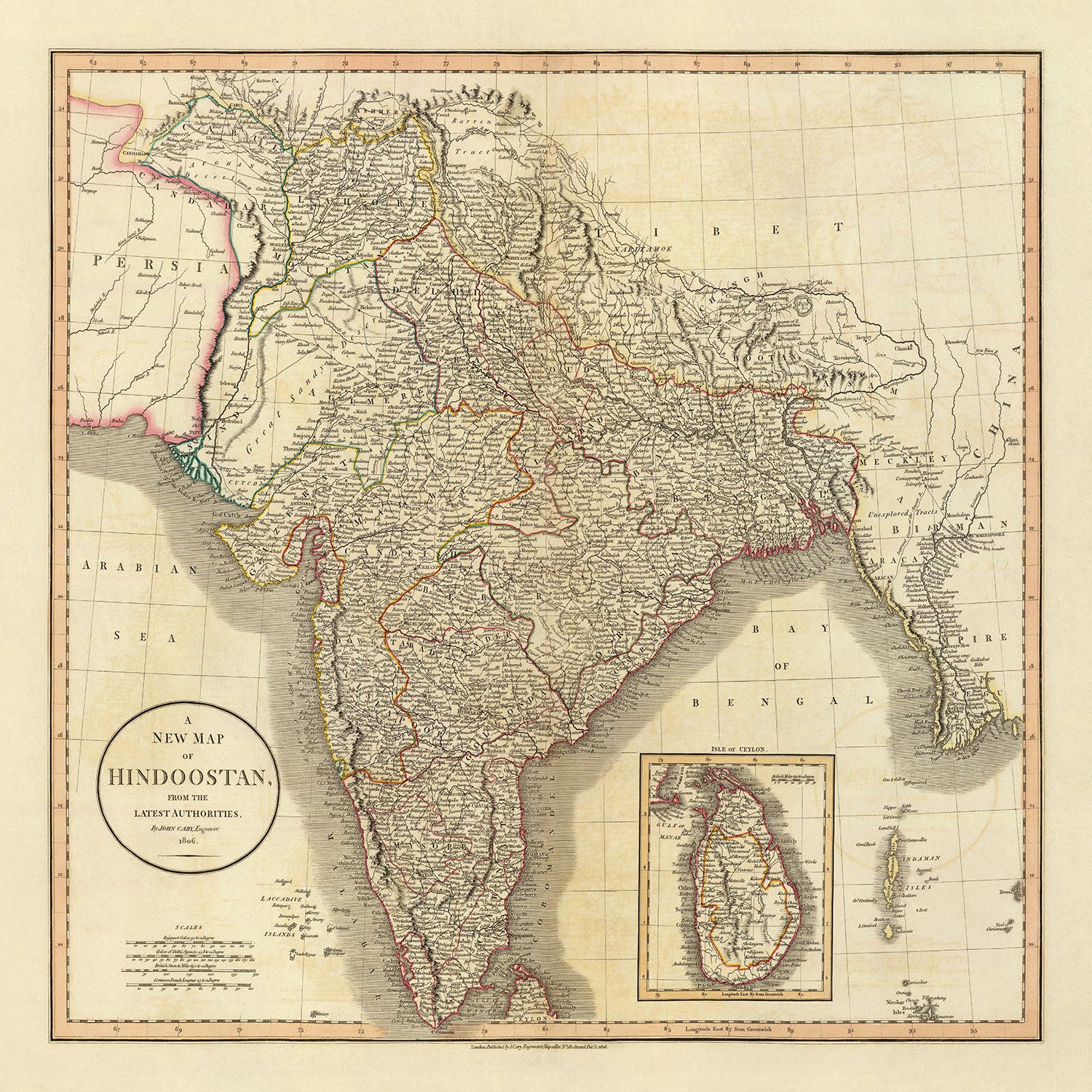 La carte 'Inde, Pakistan & Bangladesh' par John Cary, 1806, couvre une large gamme d'éléments géographiques et historiques. Voici quelques points clés, répartis par pays :