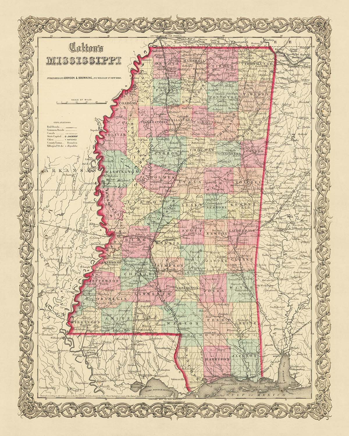 Il est important de noter qu’au cours des 150 dernières années, de nombreux noms et frontières ont changé. Cette carte capture l'essence d'une époque révolue, offrant un contraste fascinant avec l'État moderne du Mississippi. L'importance historique de cette carte, associée au savoir-faire renommé de JH Colton, en fait un ajout précieux à toute collection.