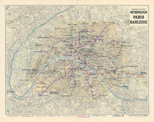 Cette merveilleuse vieille carte de Paris et du métro parisien a été publiée à l'origine en 1934. Elle a été créée par Gaillac-Monrocq.
