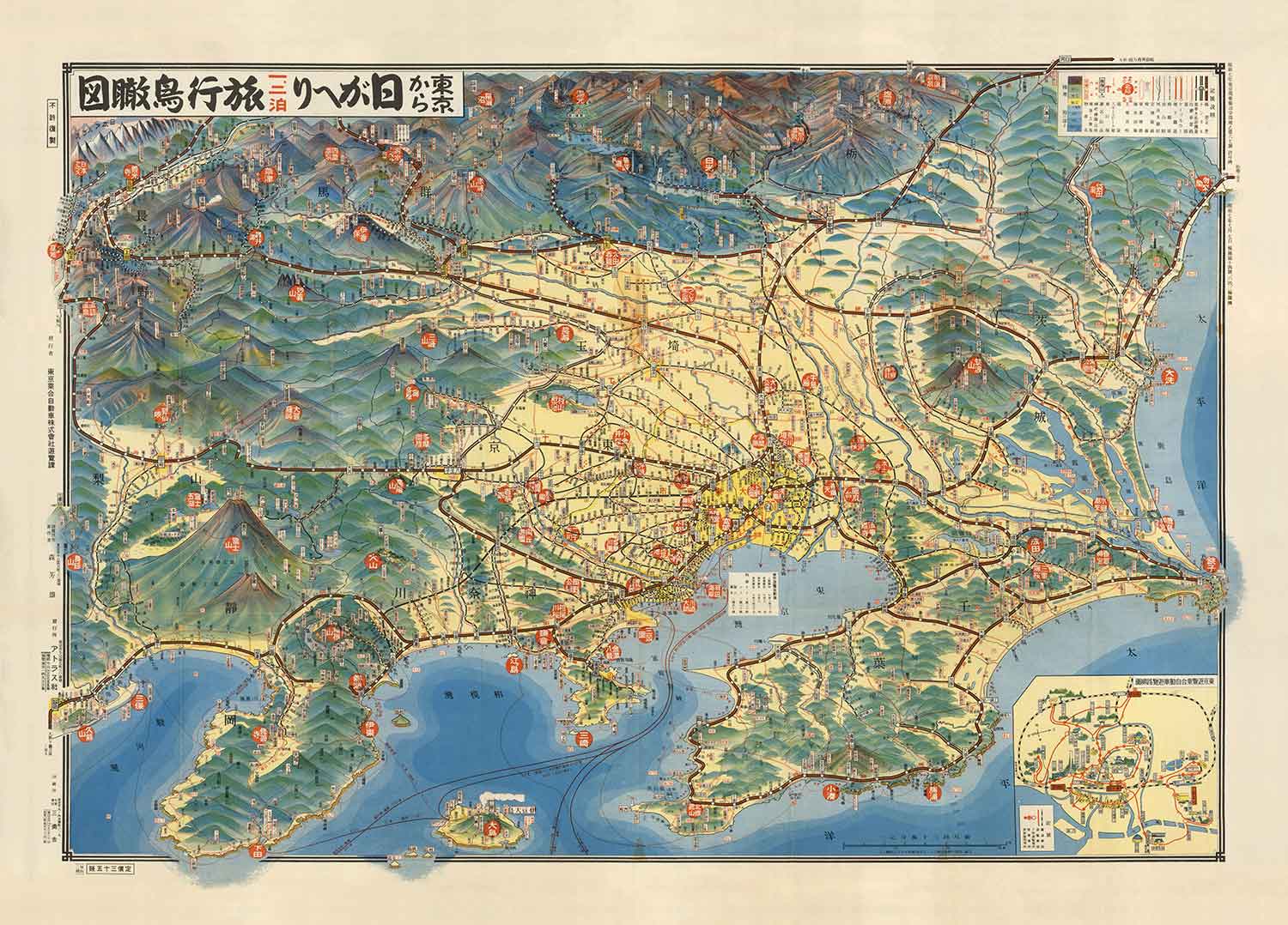 Cette carte picturale du début du 20ème siècle, entièrement étiquetée en écriture japonaise, montre Tokyo et ses environs. À cette époque, cinq banlieues et districts ruraux environnants ont été absorbés et fusionnés dans la ville de Tokyo. En conséquence, 20 nouveaux arrondissements ont été créés, portant le total à 35, connus sous le nom de Grand Tokyo.
