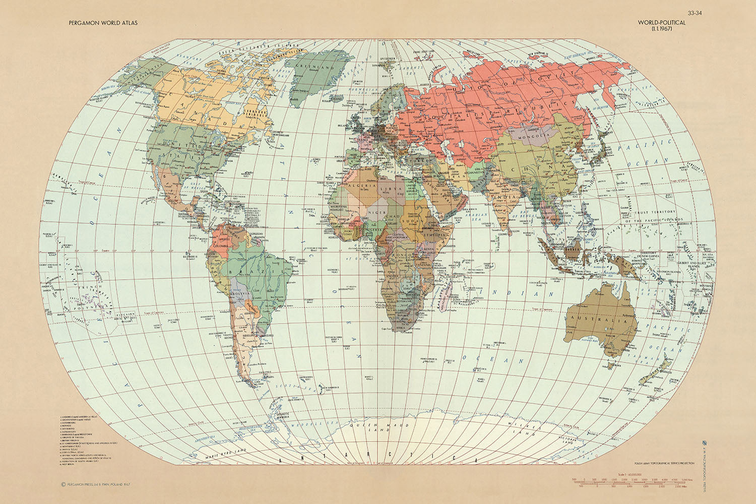 - Importance historique ou contexte de la carte : Cette carte capture les frontières politiques et le contexte géopolitique du monde pendant la guerre froide, donnant un aperçu des divisions et alliances politiques de cette époque.