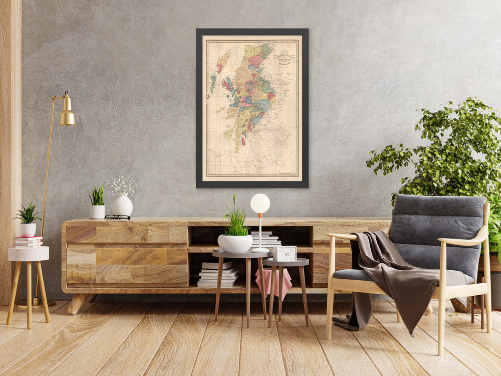 Veuillez noter que la carte non encadrée de 24x30in (61x76cm) a des bords blancs autour de la carte. Ces bords peuvent vous aider avec le cadrage, ou si vous n'en avez pas besoin, ils sont très faciles à couper avec des ciseaux. Toutes les autres cartes, y compris les cartes encadrées, ressemblent exactement aux images de l'annonce. À 8x10 pouces, il sera assez difficile de lire les plus petites étiquettes sur cette carte, bien que les noms des clans soient tous facilement lisibles.