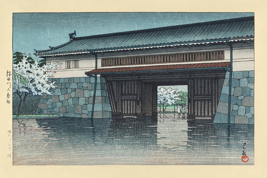"Pluie de Printemps à la Porte Sakurada, Tokyo" (桜田門の春雨) est un exemple emblématique de l'art de Kawase. Le premier plan est dominé par des pavés glissants de pluie et des figures sous des parapluies, leurs silhouettes adoucies par la douce bruine. Au-delà, la vénérée Porte Sakurada s'élève, capturée dans des bleus atténués et des bruns de colonnade, tandis que le feuillage printanier en vert frais offre un contraste subtil. L'effet global est tendre et contemplatif, évoquant non seulement la tranquillité d'un crépuscule pluvieux mais aussi un respect nostalgique pour l'héritage durable du Japon.