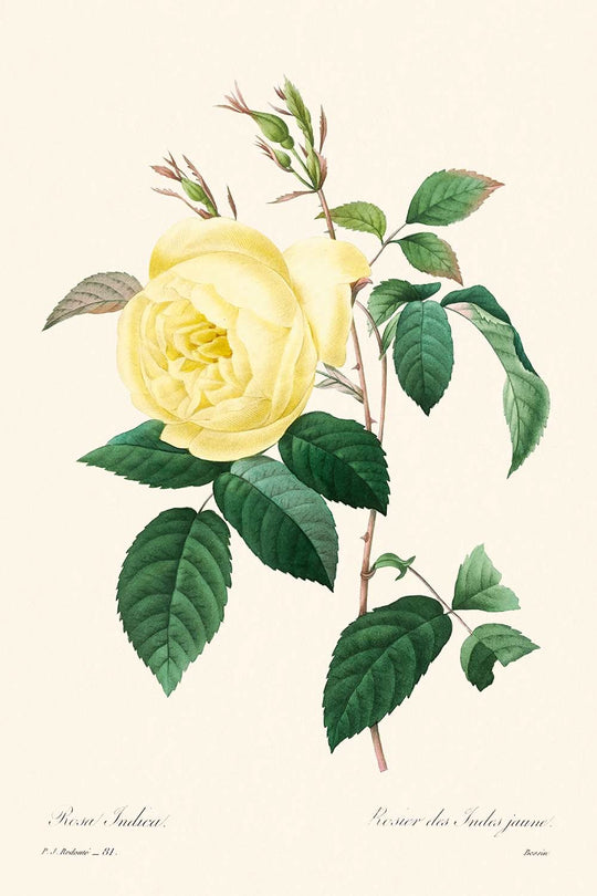 La Rose jaune, dévoilée pour la première fois en 1802, est un exemple remarquable d'illustration botanique victorienne réalisée par le célèbre artiste Pierre-Joseph Redouté. L'un des illustrateurs botaniques les plus vénérés de l'histoire, Redouté a consacré une grande partie de sa carrière à capturer la beauté des fleurs au Château de Malmaison, sous le patronage de Joséphine Bonaparte, l'épouse de Napoléon. Né en Belgique, il s'est fait connaître en tant que professeur de peinture de Marie-Antoinette, et son œuvre prolifique comprend plus de 2 100 peintures botaniques représentant plus de 1 800 espèces.
