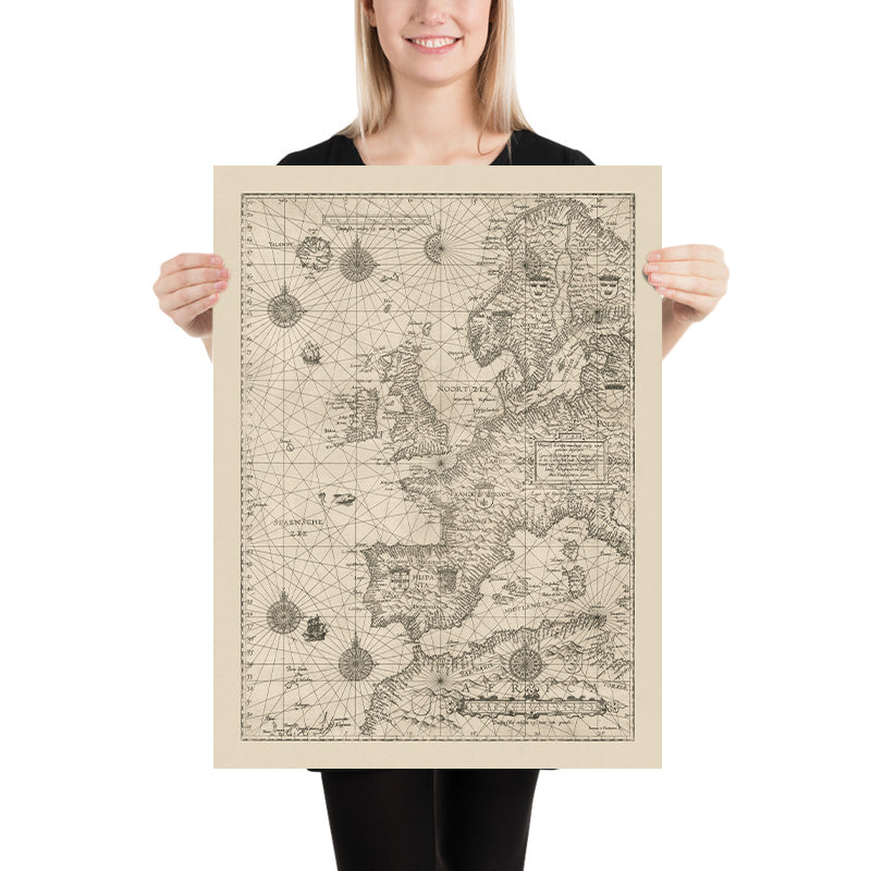 Historically, the map captures a pivotal moment in European cartography: the consolidation of practical sailing intelligence, the codification of rhumb-based navigation, and a candid record of beliefs that still shaped course and caution. It charts the working seas—the North Sea and western Mediterranean, the approaches to Iberia and the British Isles—while encoding identity through heraldry and jurisdictional symbols. For historians, it benchmarks evolving knowledge (witness the later revision of Iceland); for collectors, it embodies the dawn of the engraved sea atlas tradition. And for the eye, its central windrose, restless ships, and meticulously lettered coasts fuse data, narrative, and art into a single, navigable masterpiece.