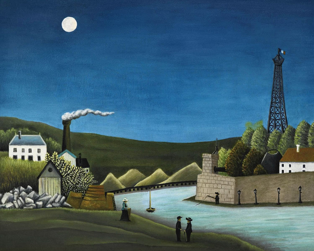 Henri Rousseau est célèbre pour son imagination débordante et la qualité onirique de ses peintures, souvent caractérisées par une flore et une faune exotiques. « La Seine à Suresnes » ne fait pas exception, mettant en valeur sa capacité à représenter des paysages sereins qui invitent les spectateurs à s'évader dans un autre monde. L'œuvre met en valeur le cours tranquille de la Seine, enveloppé d'une végétation luxuriante, capturant un moment serein qui respire la paix et la beauté.