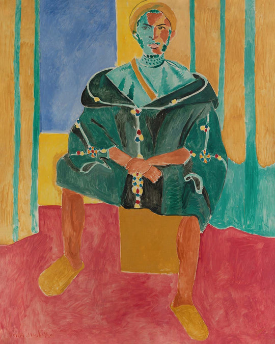 Cette impression de "Le Rifain assis" sert de pièce maîtresse parfaite pour les connaisseurs d'art moderne et les admirateurs du travail de Matisse. Elle offre l'opportunité de posséder un morceau d'histoire de l'art, présentant une fenêtre sur le modernisme précoce avec sa narration illustrative, son utilisation vive de la couleur et son intrigue culturelle.