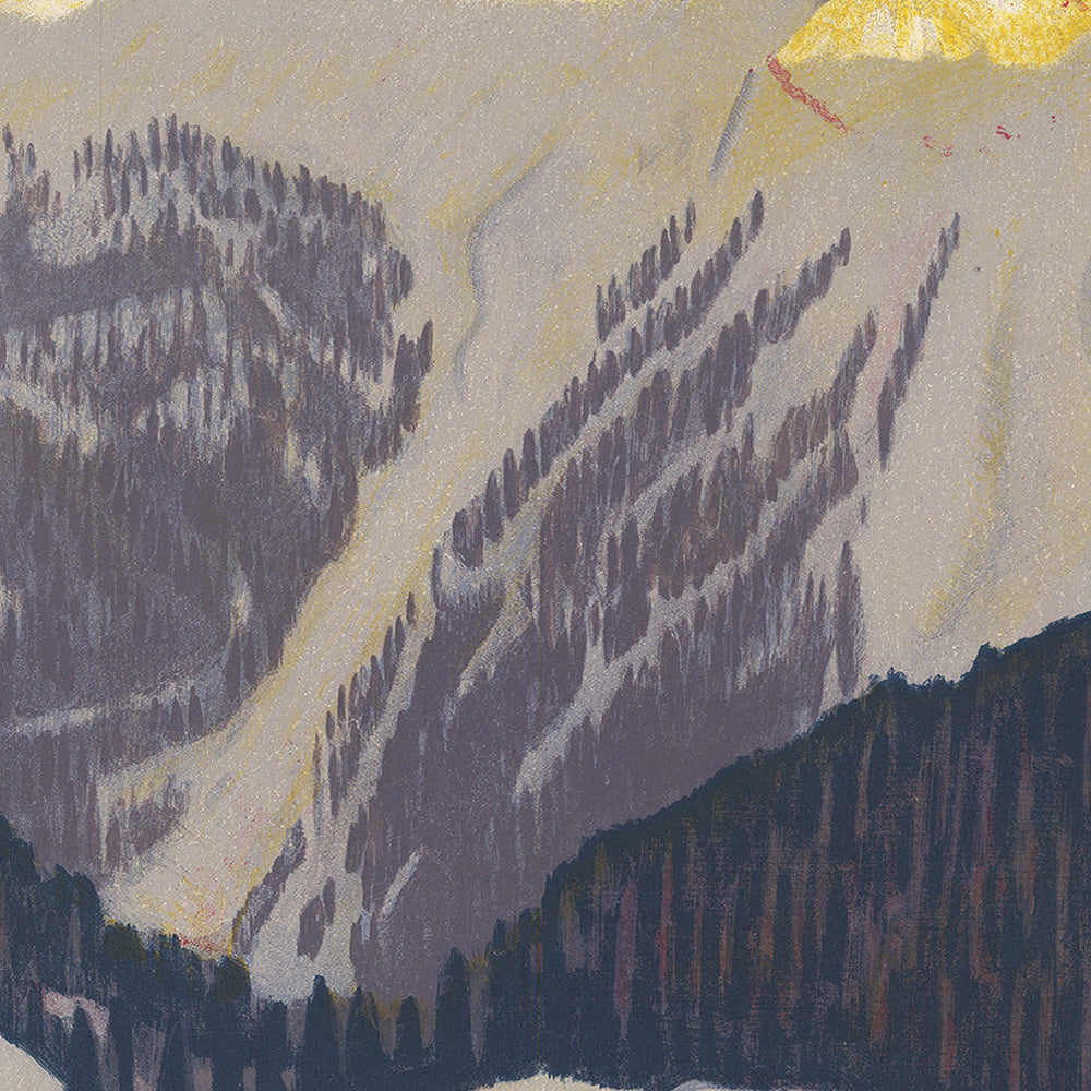 The subject itself is a classic of Swiss tourism: the Chur–Arosa railway climbs sharply through the Schanfigg valley to reach Arosa, a beloved base for winter sports and summer hiking. In 1915, this line embodied engineering ambition and the promise of effortless access to high mountain scenery. Barth’s poster distills that promise—Chur’s cultural charm below, Arosa’s bright lakes and peaks above—into a single, persuasive image that has appealed to generations of skiers, hikers, and railway enthusiasts.