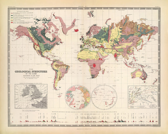 L’une des choses les plus intéressantes à propos de cette carte est sa différence avec les cartes géologiques modernes. Par exemple, le continent nord-américain s’avère beaucoup plus large qu’il ne l’est en réalité, et l’Himalaya est beaucoup plus bas. En effet, dans les années 1850, les géologues s'efforçaient encore de comprendre l'histoire tectonique de la Terre et n'avaient pas encore développé les théories modernes de la tectonique des plaques.