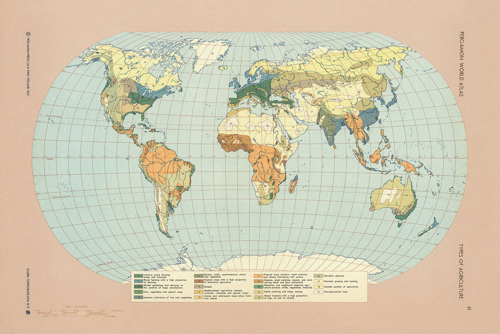 Dans l'ensemble, cette carte des Types d'Agriculture du monde est un document fascinant et informatif qui fournit une richesse d'informations sur la distribution mondiale de l'agriculture en 1967. C'est une ressource précieuse pour les chercheurs, les historiens et toute personne intéressée par l'histoire de l'agriculture.